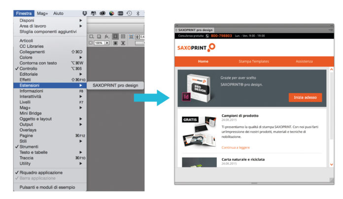 L’idea di Saxoprint, azienda che conta sette sedi in Europa e processa più di 3.500 commesse al giorno, è stata quella di sviluppare un add-on per InDesign, in pratica un modulo software che una volta scaricato dal sito di Adobe si installa all’interno del programma abilitando una palette di comandi. Con Saxoprint pro design, questo il nome dell’add-on, è possibile richiamare dall’interno del software stesso, in modo immediato e intuitivo, tutti i template di stampa dei prodotti acquistabili sul sito. All’interno di ciascun template sono pre-impostati molti dei parametri rilevanti per la stampa come il formato, comprensivo di abbondanza, le indicazioni della posizione delle pieghe, la sequenza delle pagine. Questo approccio risulta molto utile quando il potenziale cliente crea una pubblicazione ex-novo e, usando l’add- on, può fin dall’inizio della lavorazione avere già le impostazioni corrette e finalizzate per lo stampato finale. L’add-on si usa tramite una palette che si attiva con il comando Finestra>Estensioni; la palette è intuitiva da usare e prevede tre aree che consentono di accedere alla creazione guidata dei template, alla schermata di aiuto e alle informazioni generiche sui servizi offerti da Saxoprint.