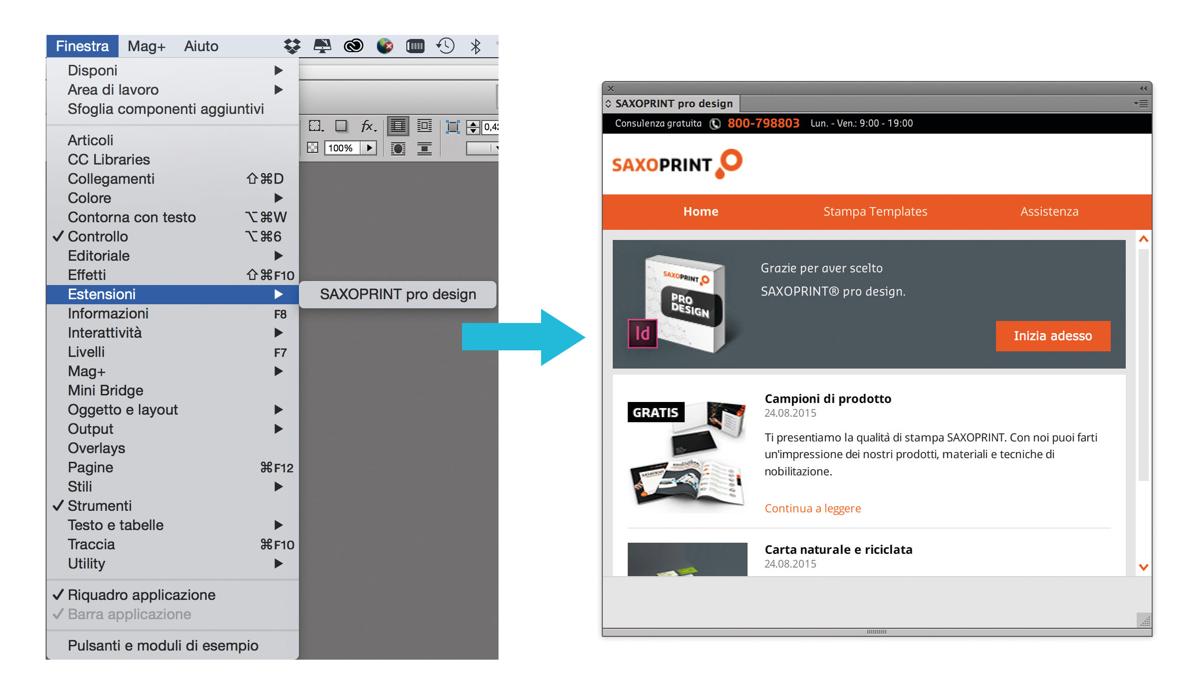 Con l’installazione dell’add-on viene aggiunta una palette contenente un menu con tre comandi principali: Home, Stampa templates, Assistenza. L’inizio della creazione del documento avviene con la scelta di un template dalla videata home della palette Saxoprint pro design oppure con il comando Stampa templates. In ogni caso l’utente entra in un percorso guidato dove, in momenti successivi, vengono richiesti i seguenti dati: tipo di prodotto, formato e numero di pagine. Naturalmente i formati proposti dipendono dal prodotto scelto evitando così ogni possibile errore.