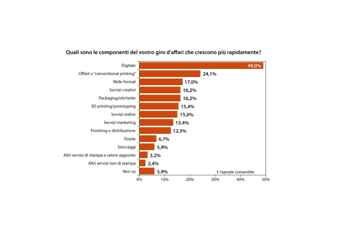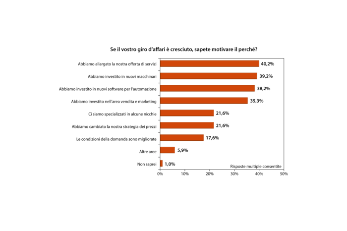 Fatta questa premessa sull’autorevolezza espressa già attualmente dal digitale, la ricerca passa poi a osservare tutta la potenza ancora inespressa da questa tecnologia, cioè quelle aree di espansione non ancora sfruttate appieno e quelle ancora del tutto inesplorate. L’indagine si rivolge quindi a poco più di cento responsabili d’aziende grafiche e domanda loro da che cosa sia dipesa la crescita del giro d’affari, qualora essa vi sia stata.