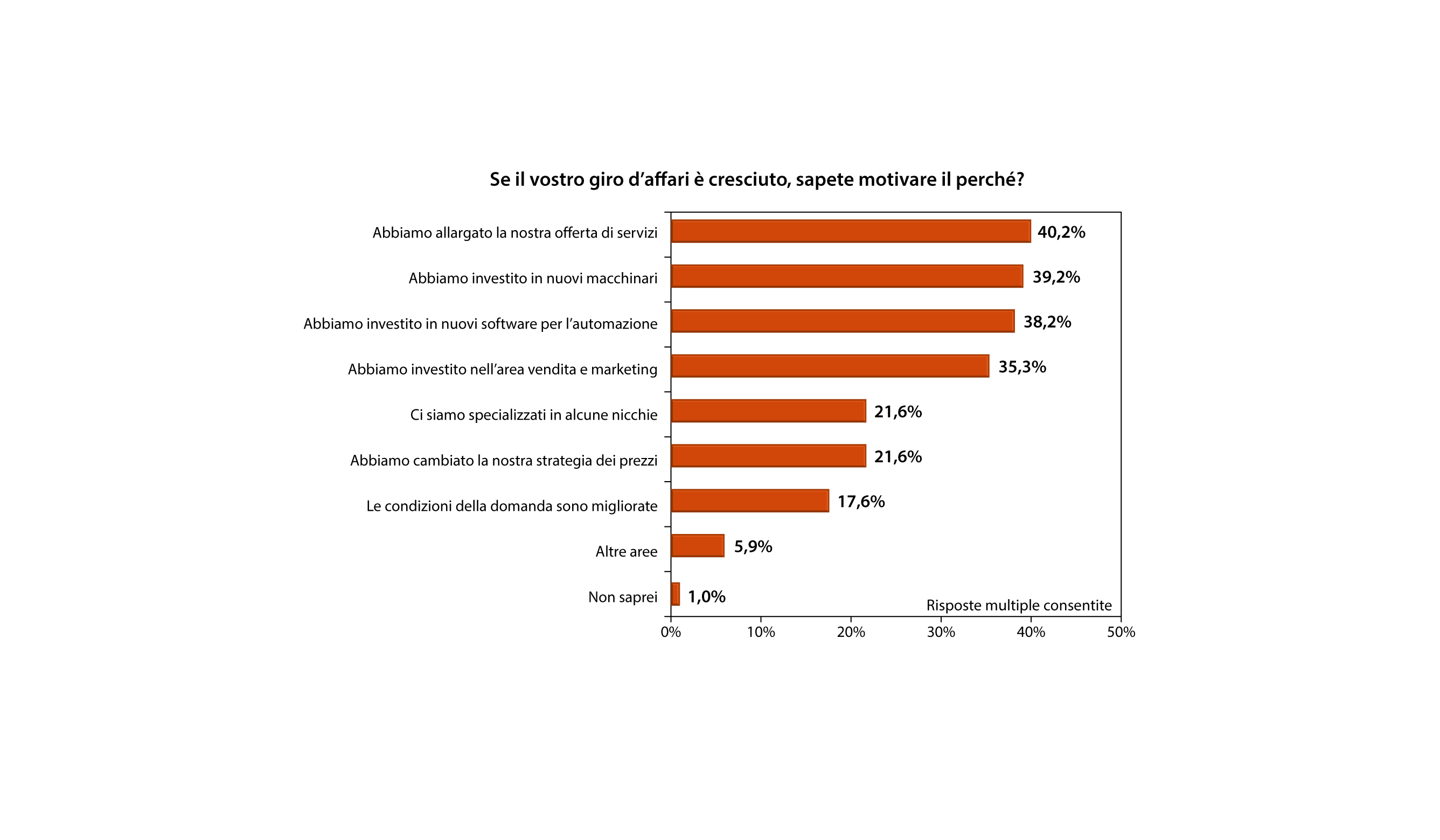 Le risposte mostrano un’interessante polarizzazione attorno a tre item significativi: l’espansione di servizi aggiuntivi verso il cliente (40,2%), gli investimenti in nuovi macchinari (39,2%) e quelli in software per l’automazione (38,2%). Anche gli investimenti realizzati nell’area vendite e marketing sono piuttosto rilevanti (35,3%) ma non vanno a toccare quegli elementi di innovazione di prodotto e di processo che tanto interessano la ricerca.