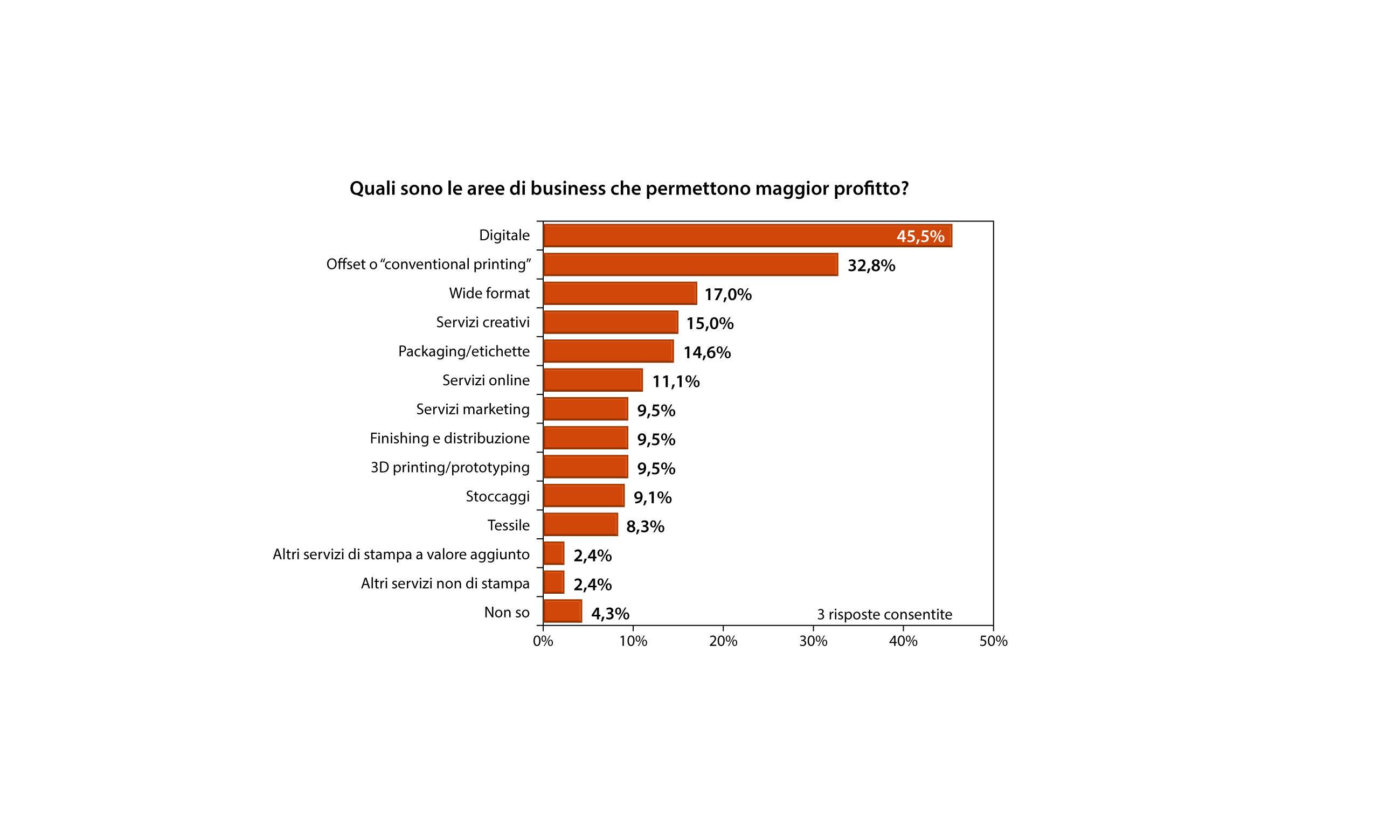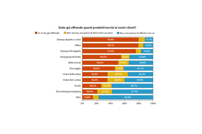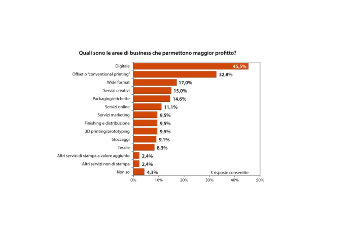 Una conferma parziale di quanto detto è anche nella risposta successiva, quella relativa alle iniziative che gli stessi stampatori metteranno in essere da qui a cinque anni per aumentare il proprio giro d’affari: ben il 52,2% afferma che si focalizzerà nella riduzione dei costi e nel miglioramento dell’efficienza produttiva, mentre il 40,3% espanderà l’offerta di nuove applicazioni e di servizi innovativi per il cliente.