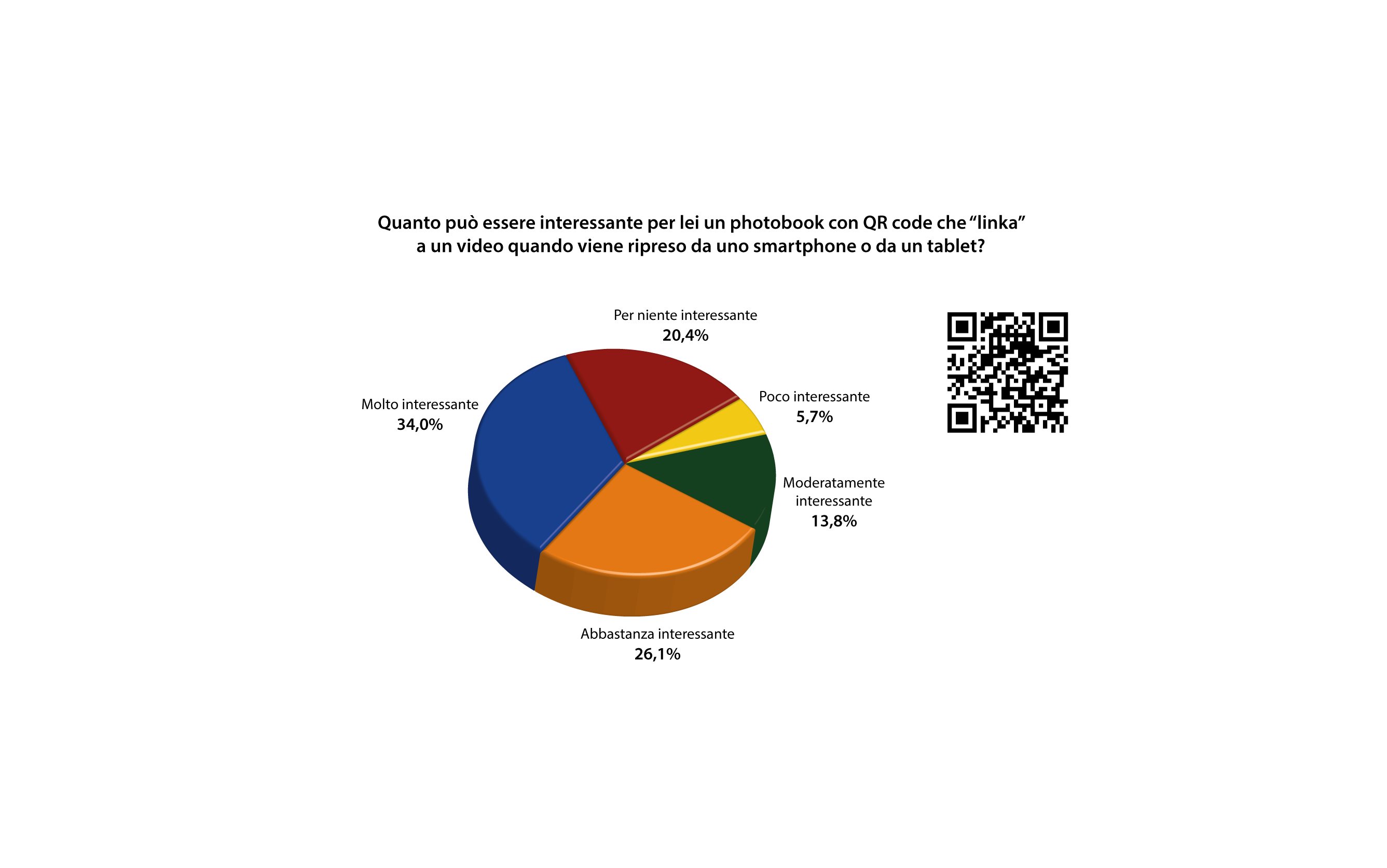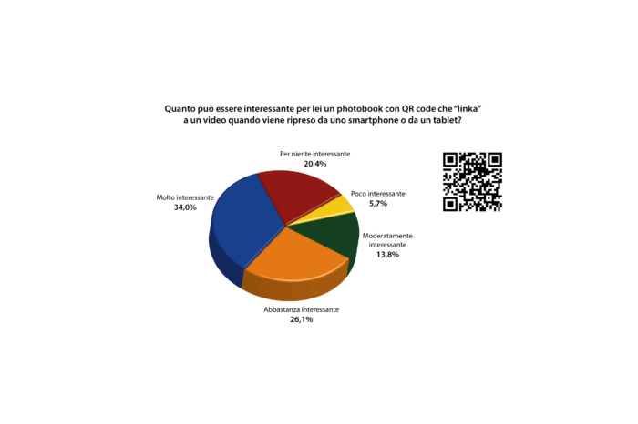 Anche in questo caso la possibilità di integrare il prodotto photobook con applicazioni di Qr code o di realtà aumentata trova grandissimo credito, con vere e proprie potenzialità applicative, come la ricerca InfoTrends non tarda a dimostrare: alla domanda se l’inserimento nel fotolibro di QR code che rimandi a un filmato attivabile e visionabile su smartphone può risultare intrigante per il consumatore, ben il 34% dei rispondenti dimostra vivo interesse, il 26,1% mostra un buon interesse, il 13,8% un interesse moderato, mentre soltanto il 20,4% si dimostra per niente interessato e il 5,7% poco interessato.