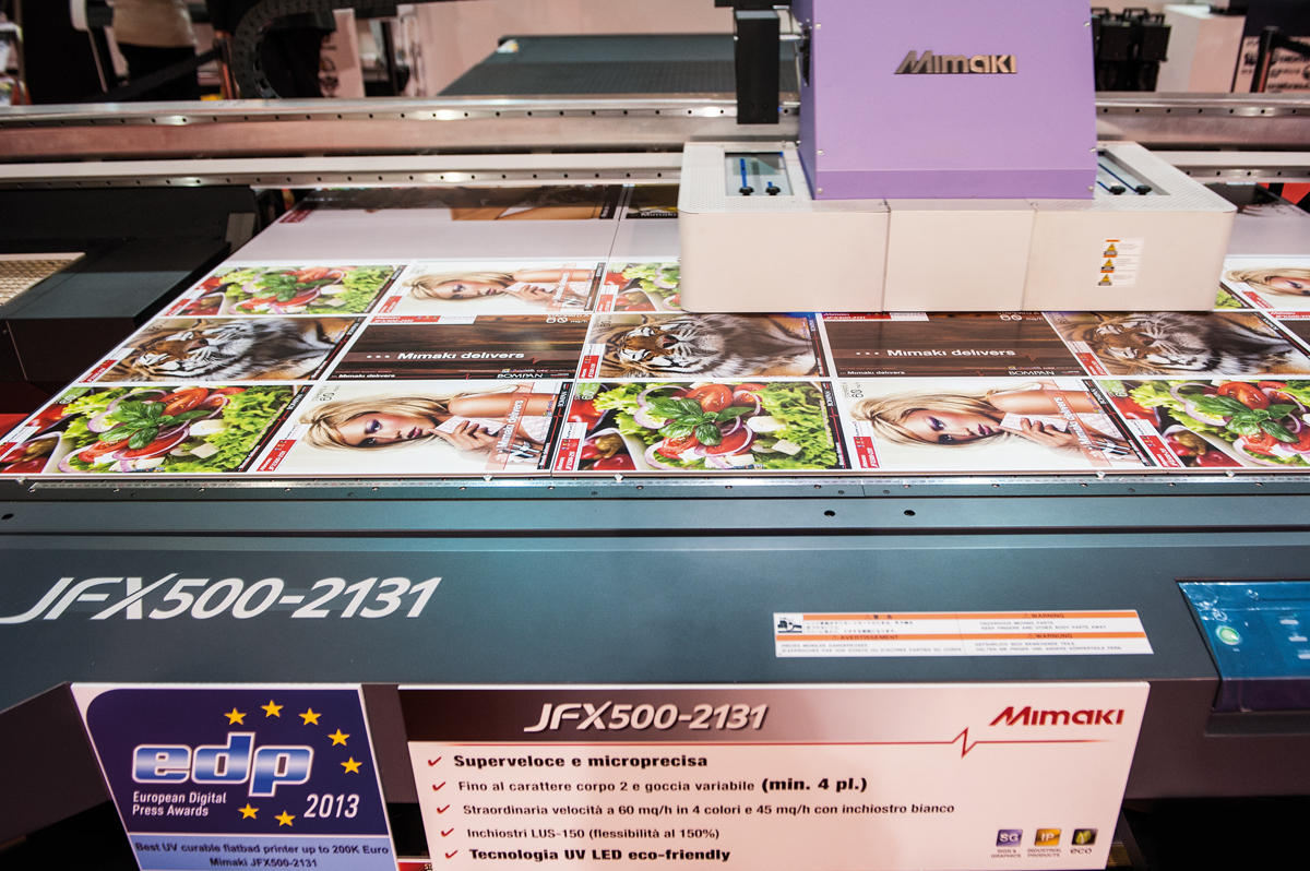 Posizione dominante sullo stand Bompan lo riveste una tecnologia solida, ad alte prestazioni e affermata come Mimaki JFX500-2131. Indicata per chi è alla ricerca di elevata produttività e massima versatilità in termini di dimensioni di stampa (2x3m), il top di gamma della serie UV LED è perfetta per produrre display e soluzioni per la comunicazione visiva, così come oggetti di design in svariati materiali che diventano creazioni originali e di qualità. Mimaki JFX500-2131 dà in fiera un saggio delle sue capacità, traendo vantaggio dalla presenza dell’inchiostro bianco stampabile ad alta velocità per personalizzare supporti neri, colorati e trasparenti e produrre applicazioni che non passano inosservate.