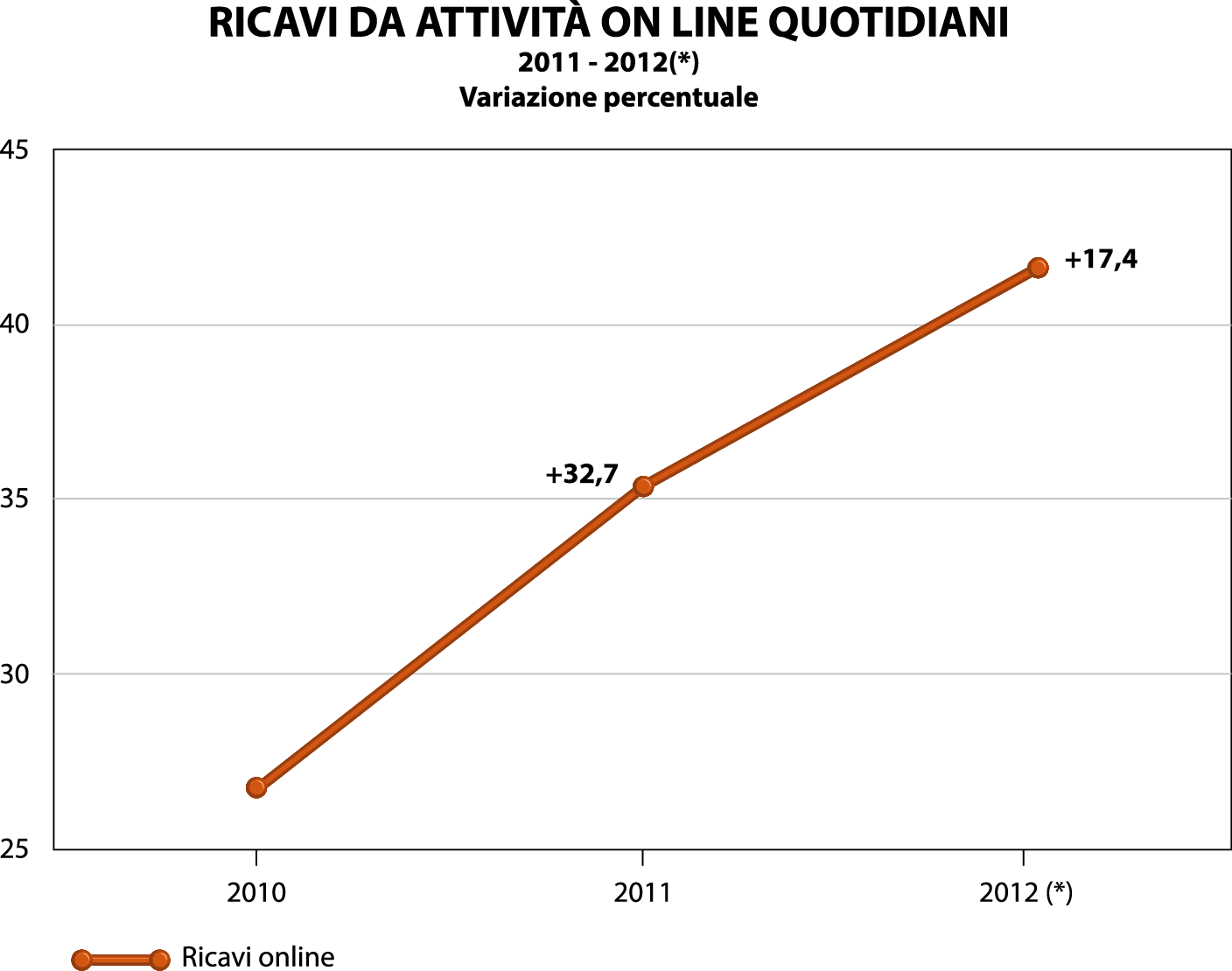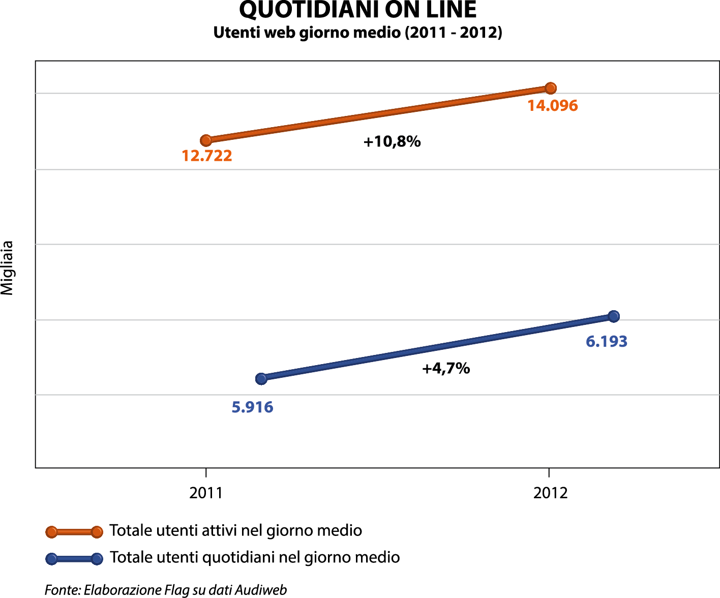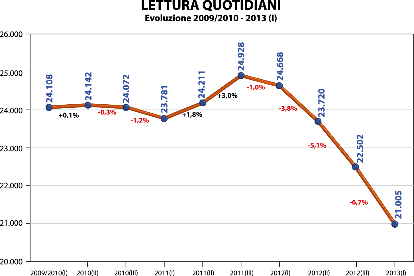 «Il 2012 è il quinto anno consecutivo che si chiude con dati negativi per il settore. I quotidiani hanno registrato una flessione delle copie vendute del 6,6%, i settimanali del 6,4%% e i mensili dell’8,9%. Negli ultimi cinque anni i quotidiani hanno perso oltre il 22% delle copie, più di un milione di persone ha smesso di comprare ogni mattina il proprio giornale», ha detto il Presidente della Fieg Giulio Anselmi nella sua relazione, illustrando la situazione dell’editoria nel suo complesso. E i dati sembrano dare ragione ad Anselmi. Il 2012 rispetto all’anno precedente è andato peggio per le aziende editoriali con alcuni segnali preoccupanti. Al dato negativo delle vendite e della diffusione, che era stato compensato negli anni scorsi dall’aumento del numero dei lettori, ora si deve sommare anche una diminuzione di quest’ultimi. L’ultima rilevazione Audipress disponibile, infatti, vede una diminuzione del 14,8% dei lettori abituali dei quotidiani e del 9,4% di quelli dei periodici, segnale del fatto che si sta verificando un significativo «scollamento» tra i giornali e la loro base di lettori.