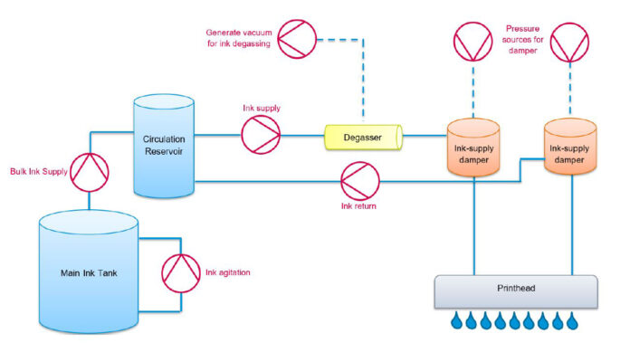 La frequenza di emissione è determinante per la effettiva velocità di produzione mantenendo costante l’emissione e la “spinta” di emissione delle gocce durante l’intero ciclo produttivo. L’effetto di questo fattore è impattante nella stampa digitale a bobina nel rapporto velocità/risoluzione, e determina a quale velocità massima potrà andare una macchina ibrida a seconda se il gruppo digitale deve stampare uno o più colori. La frequenza determina anche la composizione degli inchiostri sia per la dimensione delle parti solide sia per la viscosità: l’inchiostro entra nella camera di compressione perché richiamato dopo l’espulsione o perché spinto dal sistema di pompaggio ed affinché l’afflusso sia continuo e l’espulsione costante la viscosità deve rimanere fissa. Per questo fattori compromettenti come la variazione di temperatura e la miscelazione dei compenti degli inchiostri siano sempre sotto controllo utilizzando sistemi di pompaggio e afflusso adeguati. Dato che alcuni inchiostri possono formare più depositi di altri, le teste a più alta risoluzione (che hanno nozzle più fini e più densi) sono costruite con un sistema di ricircolo che mantiene in agitazione costante l’inchiostro evitando che le parti solide e gli additivi si concentrino in modo anomalo nel foro di espulsione.