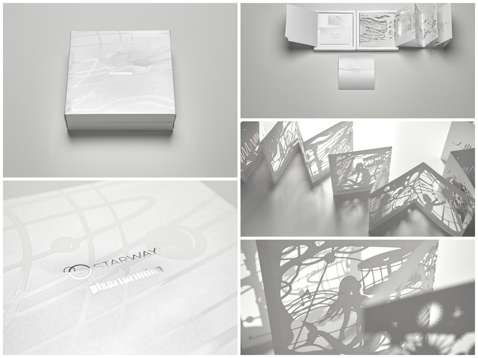 L’edizione 2016 del loyalty programme by Pixartprinting riserva importanti sorprese. L’esclusiva welcome luxury box è un ricercato cofanetto reso ancora più prezioso da una tinta bianco puro, realizzata con una carta pregiata. L’elegante apertura a libro suddivide anche concettualmente il suo contenuto: nella parte di sinistra si trovano la lettera di benvenuto, la card nominale con le chiavi di accesso ai servizi esclusivi e la brochure esplicativa del programma. Nella sezione di destra della scatola è inserita un’opera d’arte originale in edizione limitata, commissionata da Pixartprinting all’artista Matteo Capobianco, noto con il nickname di Ufocinque. Si tratta di un diorama, realizzato nel formato di 336 cm con taglio laser artistico della carta, un materiale strettamente connesso al business del W2P veneziano. L’opera, ripiegata all’interno della confezione, è una rappresentazione artistica del concept di Starway che può essere esposta dal destinatario in casa o in ufficio. Sull’artefatto, inoltre, è stampato un testo poetico che arricchisce il cadeau con una narrazione inedita.