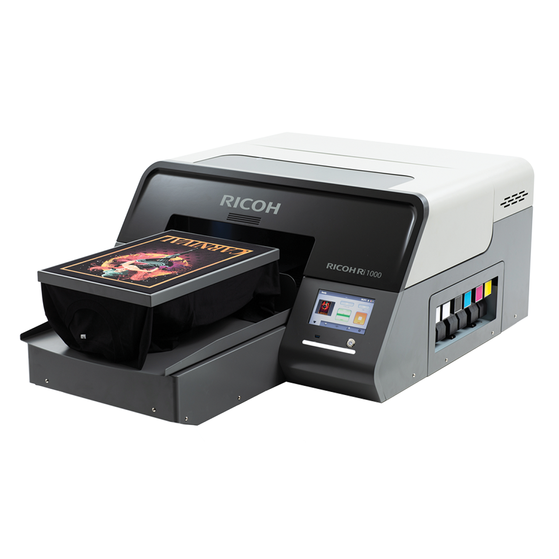 Ricoh Ri 1000 entra a far parte della gamma Ricoh di soluzioni direct to garment. Offre una qualità di stampa elevata con una risoluzione di 1.200 x 1.200 dpi ed è compatibile con gli inchiostri CMYK + bianco assicurando risultati eccellenti su tessuti di qualsiasi colore.