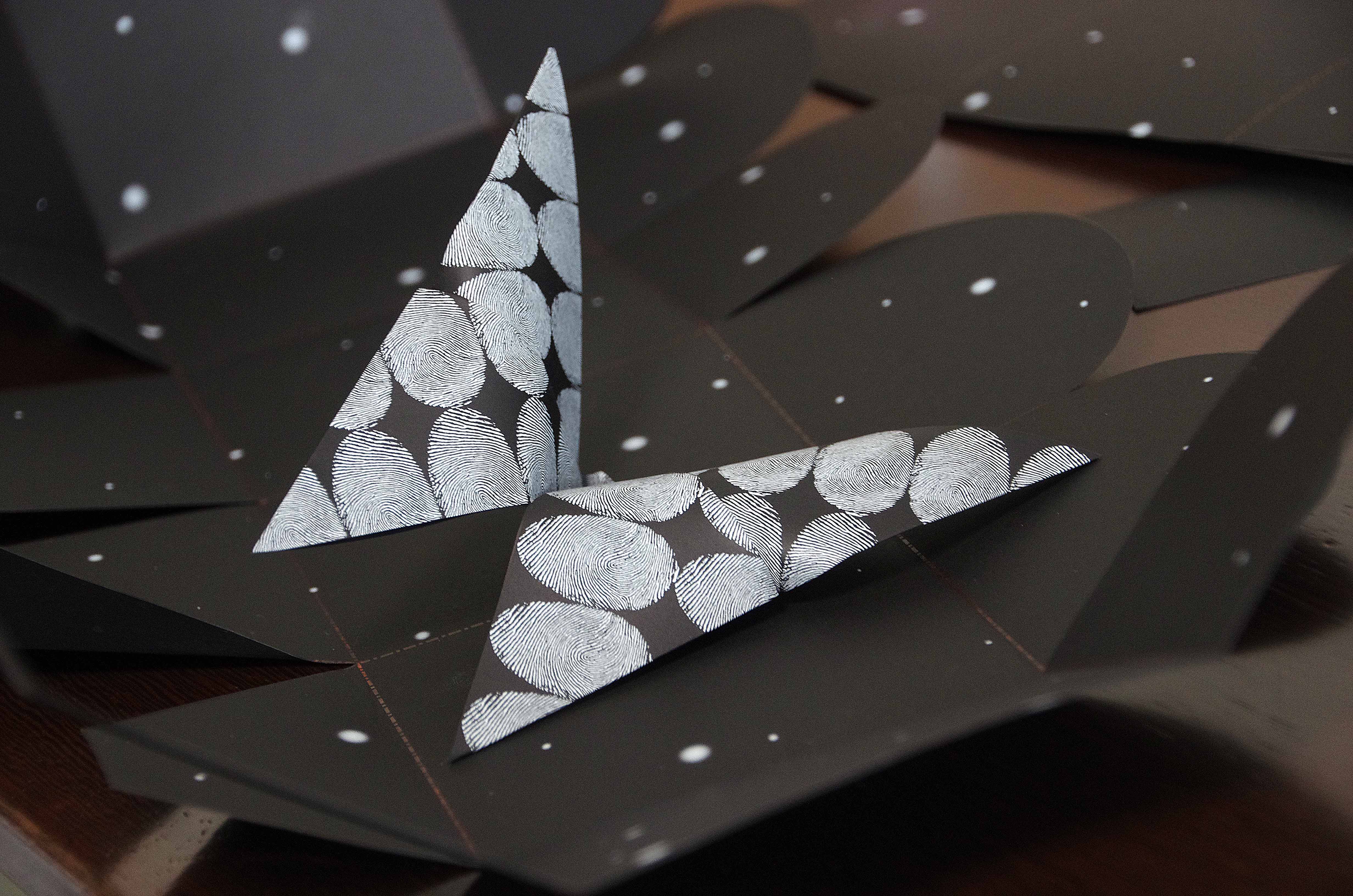 «Il mio lavoro, Purinto Kami” (carta stampata e piegata), si richiama alla tradizione giapponese del dono, fatto in particolare, a chi doveva partire», ha dichiarato la vincitrice nell’illustrare la propria opera d’arte. «Ho realizzato, così, delle scatole, al cui interno si trova un origami a forma di farfalla. Questo insetto è simbolo della trasformazione, metafora di quanto è in grado di realizzare la soluzione di stampa Ricoh Pro C7100X. Nella mia attività artistica svolgo spesso performance legate alla body art che qui trova espressione nelle mie impronte digitali, che percorrono tutto l’origami. Le impronte bianche valorizzano le potenzialità del quinto elemento».