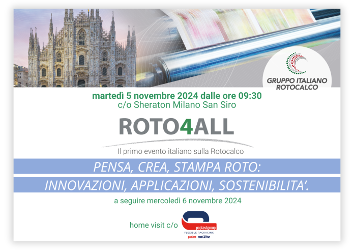 In linea con quanto già fatto nell’edizione 2023, dove il convegno primaverile è stato accompagnato in autunno, da una visita nella sede di un produttore di tecnologia rotocalco, Roto4All 2024 sarà seguita, mercoledì 6 novembre, da una home visit presso lo stabilimento Poplast Group di Castel San Giovanni (PC), per avere l’opportunità di guardare in prima persona al valore delle soluzioni di questa tecnologia di stampa.