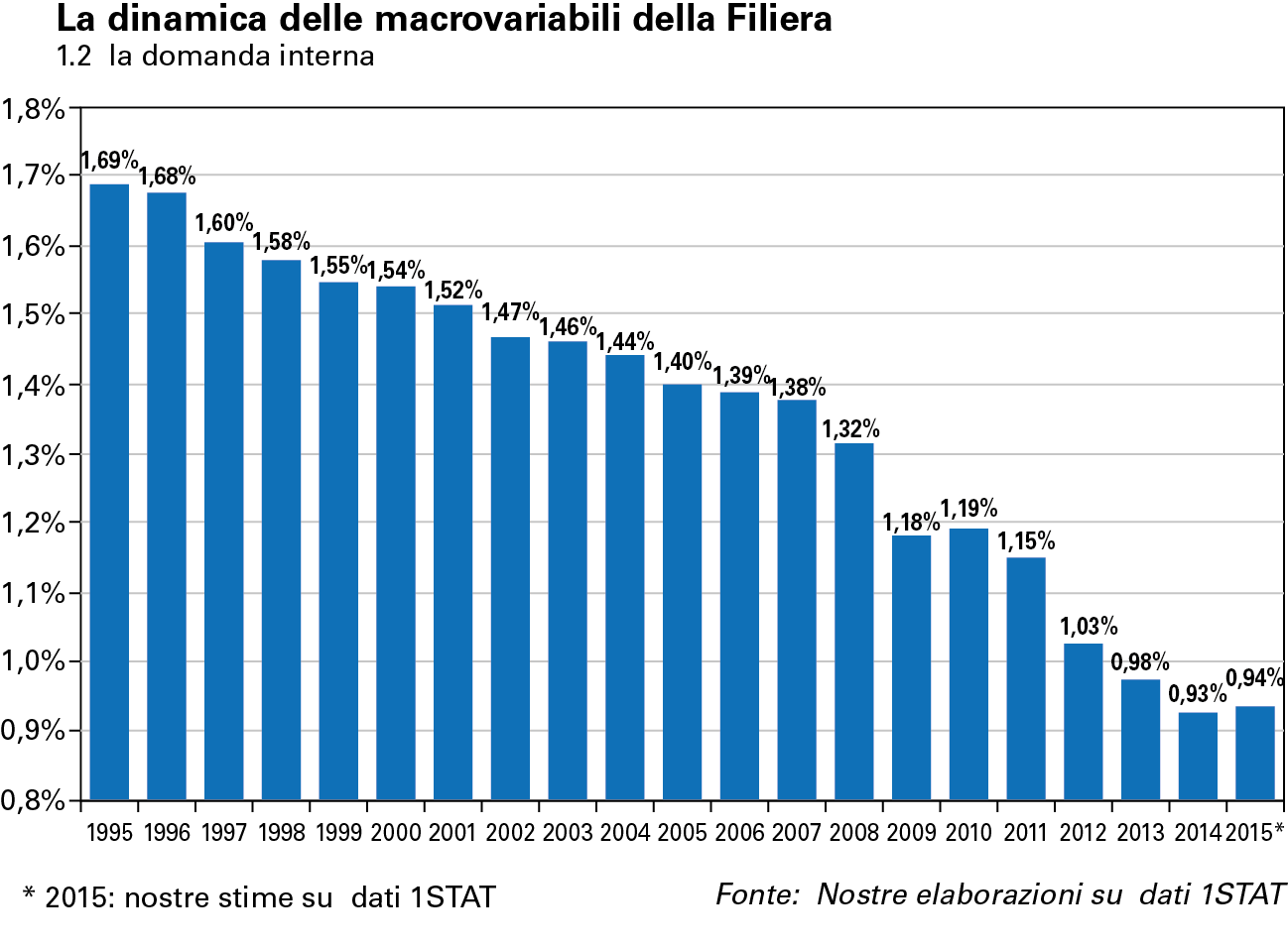 Queste proposte sono state fatte durante l’appuntamento annuale della filiera, che si è tenuto a Roma il 16 marzo scorso, e nel quale si esaminano ogni anno nel dettaglio tutte le dinamiche del settore. Un settore, quello della carta, nel quale si intravedono degli spiragli, come del resto nell’economia più in generale, che però sono ancora troppo deboli per poter essere considerati l’inizio di una risalita per l’uscita da una crisi che ormai dura da otto anni e ha assunto caratteristiche strutturali che devono essere affrontate con politiche altrettanto strutturali. «Registriamo un lieve miglioramento sul 2014 – ha detto Massimo Medugno, direttore di Assocarta, illustrando i dati – rimaniamo però sui livelli degli anni horribilis del 2008-2009, con lieve miglioramento circa il 2014». I dati 2015 secchi della filiera sono di un fatturato di 30,63 miliardi di euro, due punti di Pil, con un export che conta per circa un terzo, 9,48 miliardi e 687mila addetti, dei quali 197mila diretti e 490mila indiretti. Sul fronte della domanda interna, tra il 2007 il 2015 questa è calata di 12 miliardi di euro, mentre il fatturato è sceso di 10,8 miliardi. La debolezza, per la filiera della carta, è la domanda interna che ha visto dei piccoli miglioramenti, un più 0,7%, mentre nel frattempo sono ancora più marginali i miglioramenti del fatturato complessivo, con un più 0,2%. La ripartenza della filiera non c’è stata e le perdite rispetto ai valori precedenti a quelli della crisi rimangono notevoli. E le motivazioni dei due provvedimenti già illustrati risiedono proprio nella progressiva e continua riduzione del tasso di consumi di libri e giornali delle famiglie in rapporto ai consumi totali delle stesse negli ultimi venti anni. Si è passati dall’1,69% del 1995 allo 0,94% del 2015, con un lieve aumento nel 2015 sul 2014, dove si è toccato il fondo con un 0,93%. Ma lo 0,1% è ancora troppo poco per poter parlare sul serio di una ripresa.