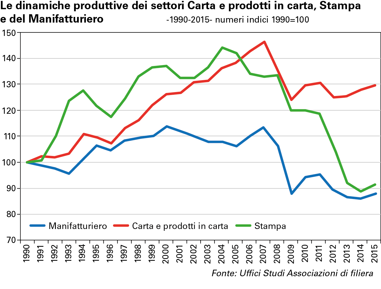 I prodotti in carta e la stampa, che sono poi i maggiori segmenti della filiera, possiedono dinamiche simili a quelle che appartengono alla produzione industriale più in generale. Il comparto «stampa e grafica» ha di sicuro più problemi, visto anche il fatto che è in diminuzione costante dal 2004. Si è vista anche in questo segmento una piccola ripresa che però, come abbiamo detto più volte, non è stata giudicata indicativa dagli analisti della filiera. Siamo, quindi in un momento cruciale, di stasi che con ogni probabilità non durerà a lungo. Un momento nel quale è necessario decidere quale strategie prendere.